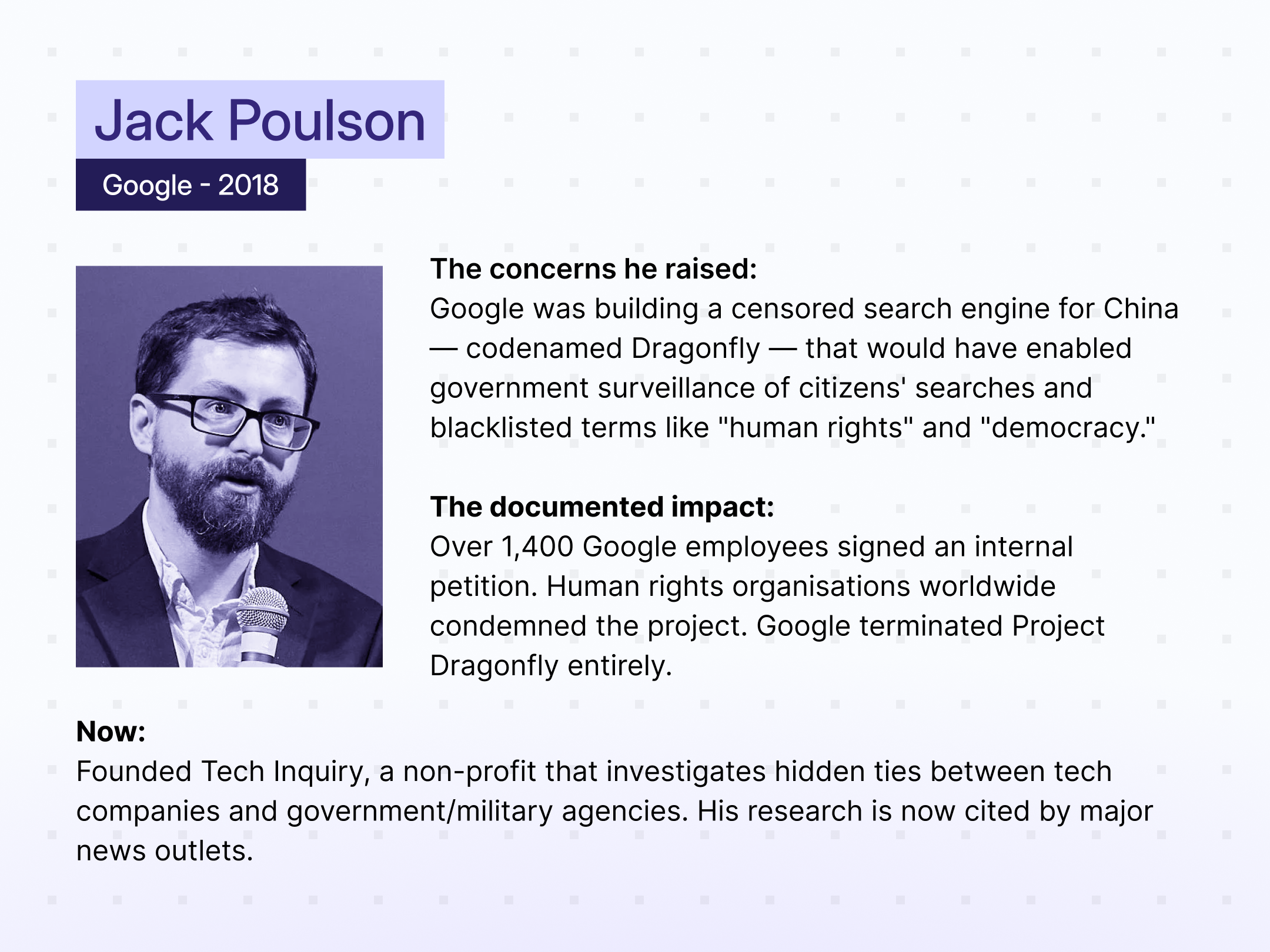 Jack spent approximately one month seeking internal clarification at Google about Project Dragonfly before resigning. His public advocacy contributed to the project's termination.