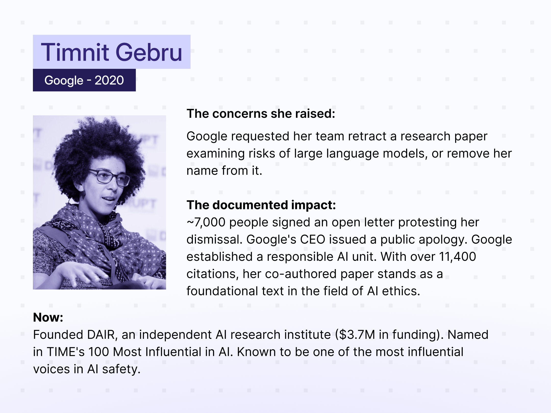 Timnit raised concerns about AI ethics research at Google. She had manager approval before executives blocked publication, and she was pushed out. The case contributed to the establishment of Google’s responsible AI unit.