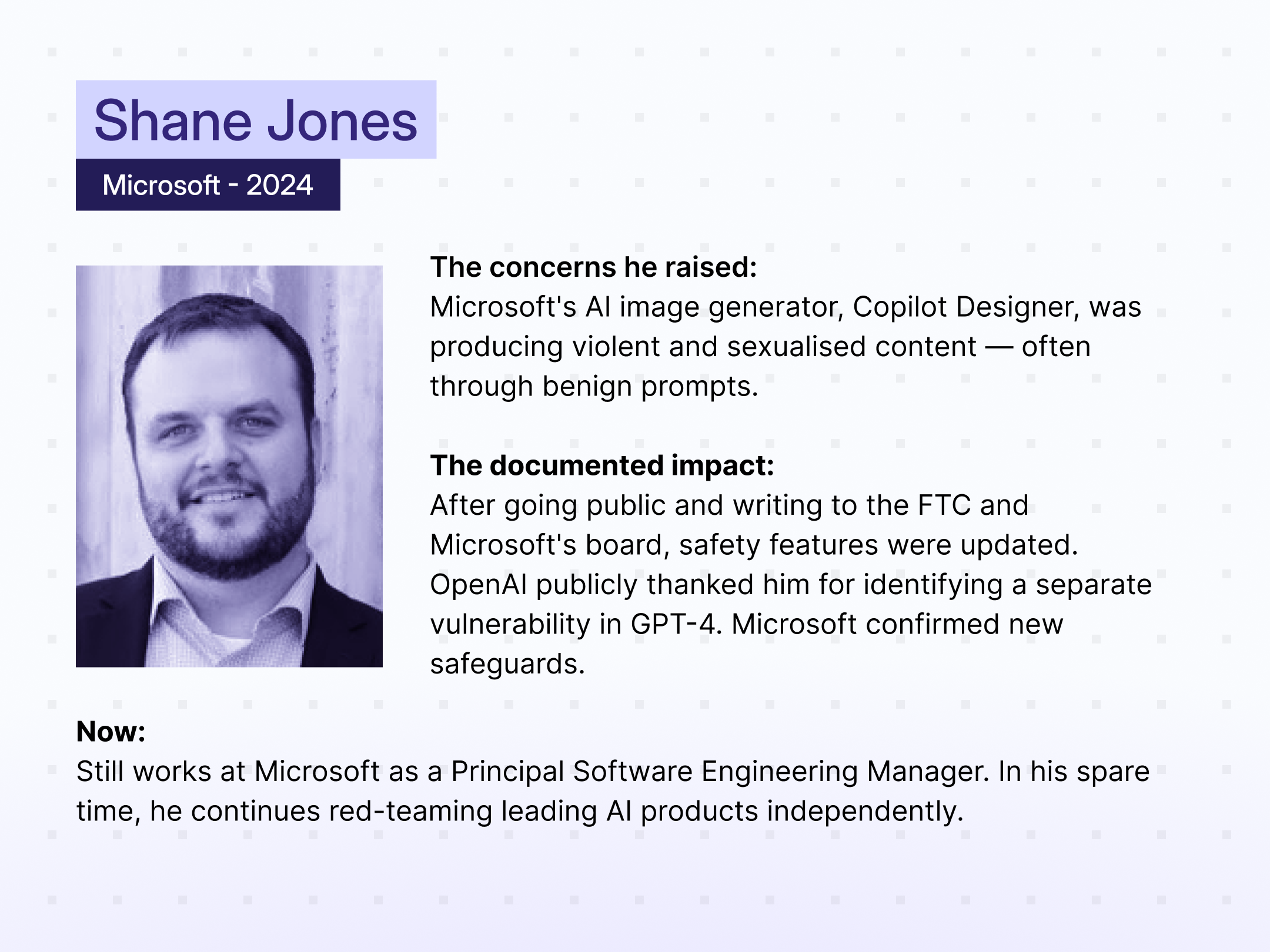 Shane raised concerns about Copilot Designer, Microsoft’s AI image-generator tool, which was able to create violent and sexualised content. Though the product was never taken off the market, certain safety features have since been updated.